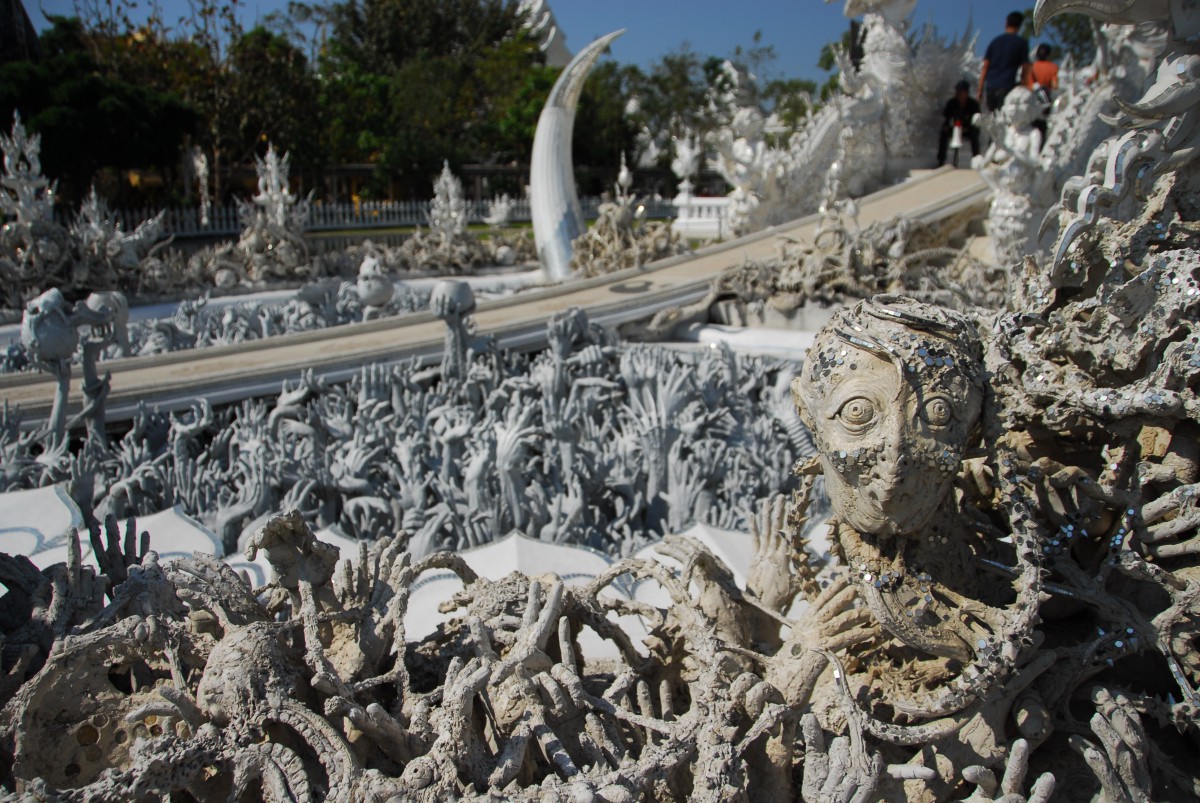 Le lendemain, nous louons une moto pour nous rendre au 2 temples que nous voulons visiter, mais cette fois-ci il s’agit de temples-musées contemporains que tout oppose. D’une part le white temple, construit dès 1997 par un peintre-architecte en hommage au roi, au bouddha et à l’illumination. Une folie kitschissime intégrant même alien, iron man et autres super-héros.