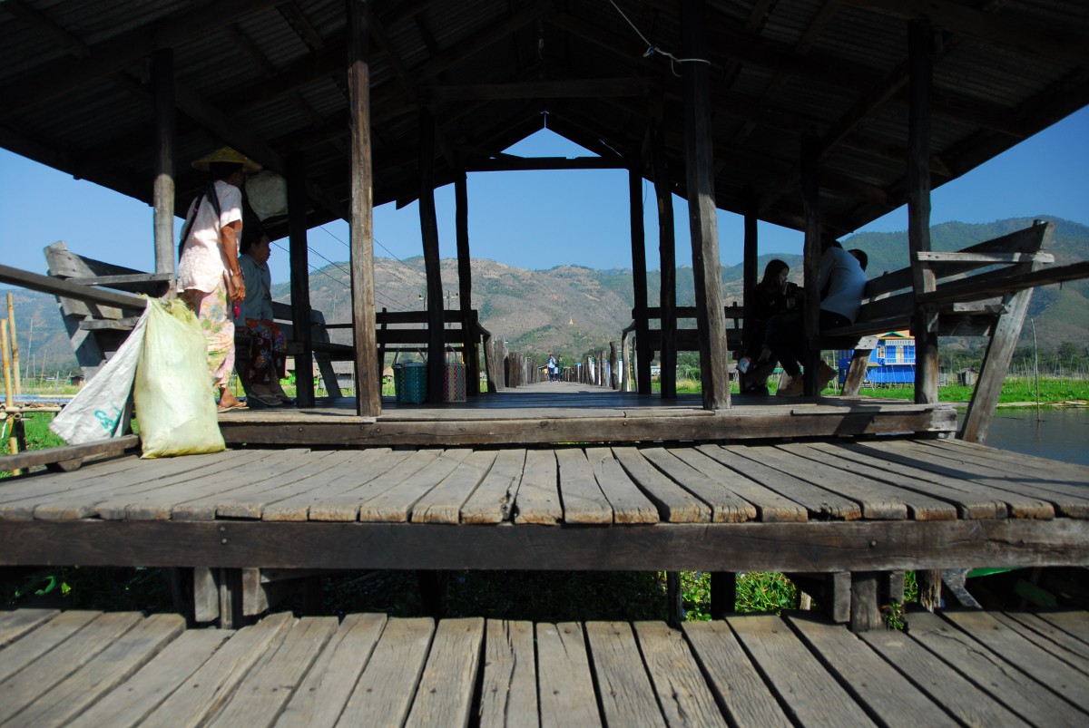 Nous y faisons aussi la connaissance d’un Roumain vivant en France qui nous propose de traverser le lac en bateau ensemble, car ça revient moins cher. Nous continuons donc en vélo jusqu’à Kaung Daing, dînons ensemble et louons les services d’un batelier (vélos compris) jusqu’à Maing Thauk. Le paysage du lac est magnifique, avec les jardins flottants, petites maisons sur pilotis et bateau de pêcheurs.
