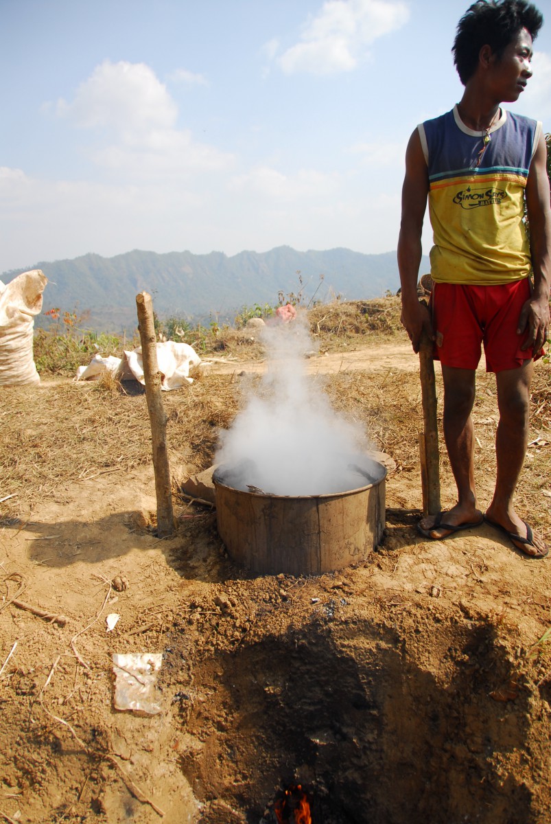 A midi, on s’arrête sur le sommet de la première colline et mangeons une soupe de nouilles assez bonne. Une fois repus, nous découvrons comment ils cuisent le curcuma avant de le sécher, car il se vend plus cher en poudre que frais.