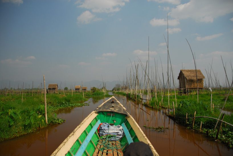 Finalement nous quittons la rive et traversons d’abord les jardins flottants (ou champs flottants plutôt), une immense étendue de cultures sur le lac, puis le lac lui-même jusqu’à Nyuangshwe.