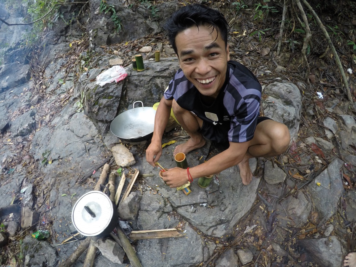 On installera notre camp pour la nuit au pied d’une cascade, qui sert de bain, de douche, de lave-linge, de lave-vaisselle et de source pour la cuisine. Nos guides installent une structure de troncs pour suspendre nos hamacs, on mange, on discute à la lueur d’une bougie et… Vuthy réapparaît après une courte absence avec une bouteille en PET dans laquelle gisent une anguille et une grenouille pour le petit déjeuner! Et il nous propose de le suivre à la chasse à l’anguille, hilare de notre réaction médusée.