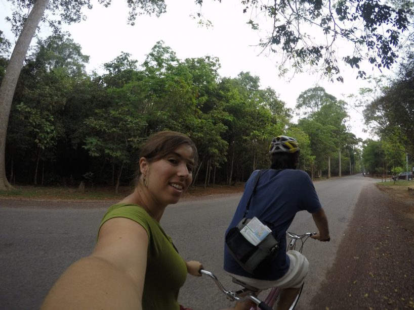 A 6h30 du matin nous sommes déjà sur notre tandem! Nous avons bien fait de renoncer à la photo d’Angkor Wat à l’aube, le ciel étant nuageux (olé olé!!). En plus, nous aurons un jour moins chaud et parfait pour le vélo (olé olé again!!). Notre objectif du jour est de visiter les temples du circuit principal, qu’ils appellent petit circuit.