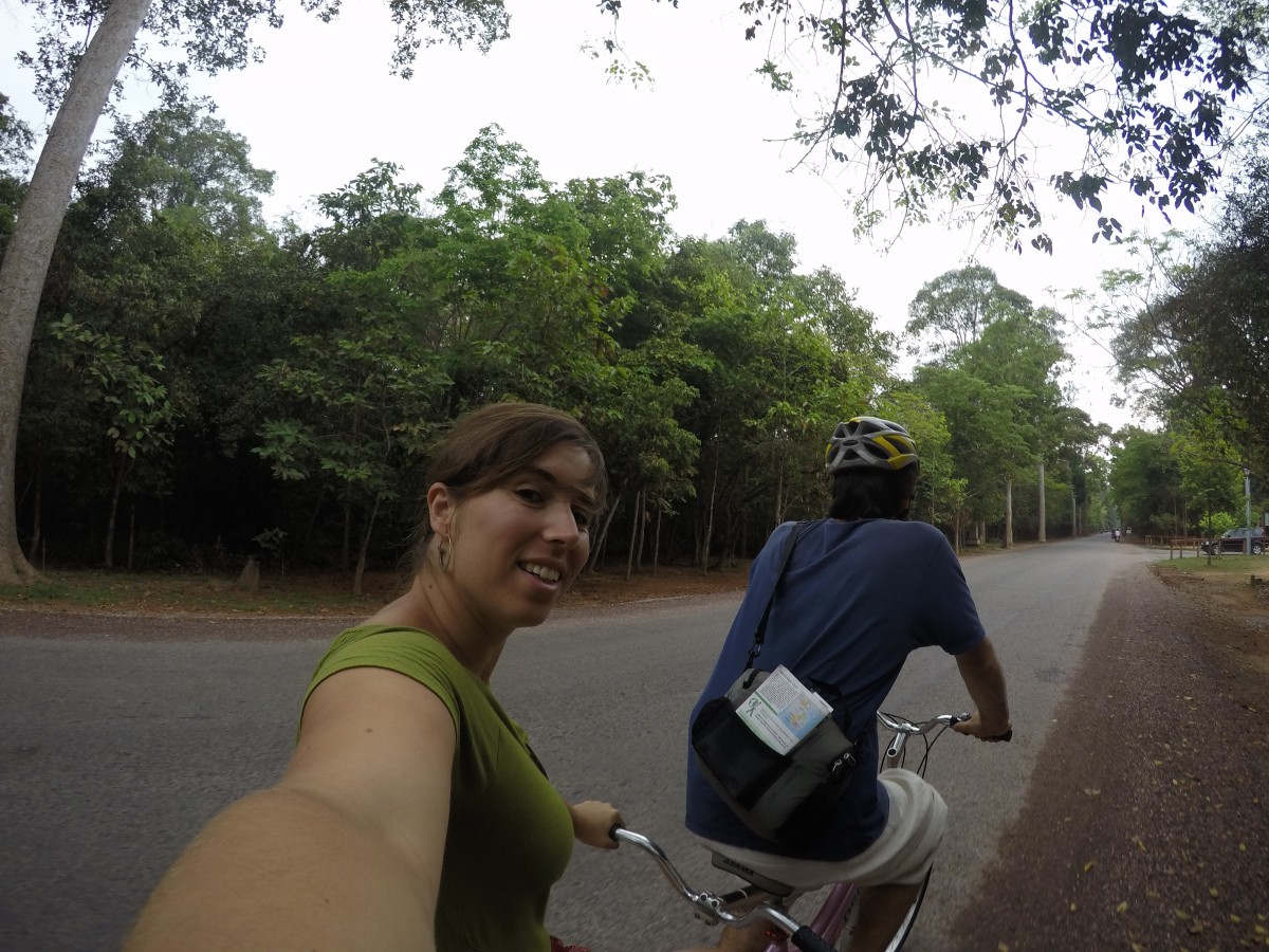 Le premier arrêt nous permet d’acheter les billets pour le parc national (37$ par personne O_O). Il n’y a pas de queue et tout va très vite: ils font une photo, impriment les billets et voilà – prêts à pédaler! Il faut aussi dire que tout les locaux que nous croisons nous regardent comme s’ils n’avaient jamais vu de tandem et rigolent. Même les conducteurs de tuk-tuk nous font des commentaires :P.